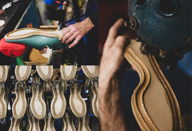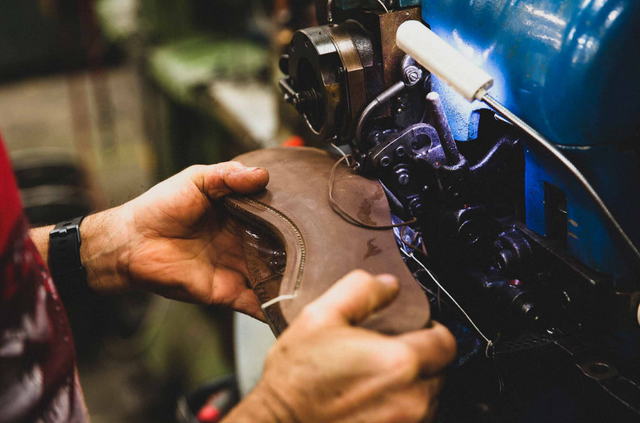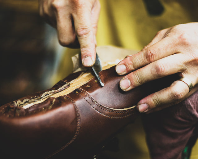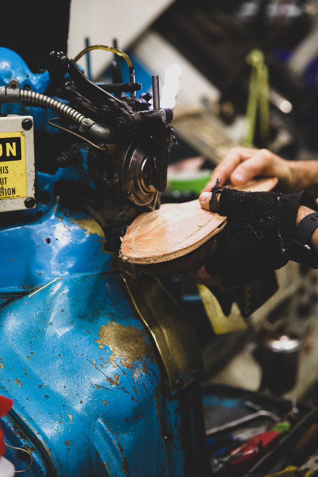 During the lasting phase, we skive the upper leather by hand and turn the vamp outwards which gets sewn directly to the 4.8-5mm solid leather midsole. The second row of stitching then attaches the outsole to the midsole and vamp before the heel is finally nailed in. This creates a highly durable and robust product that is best suited for heavyweight leather.