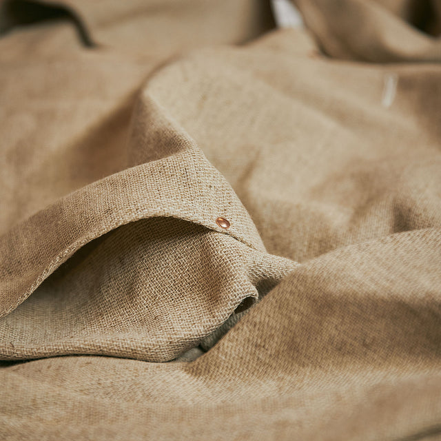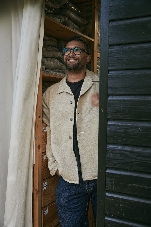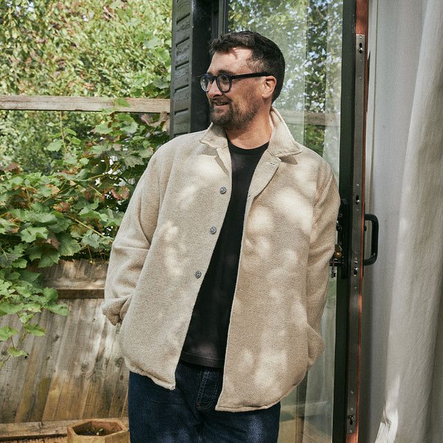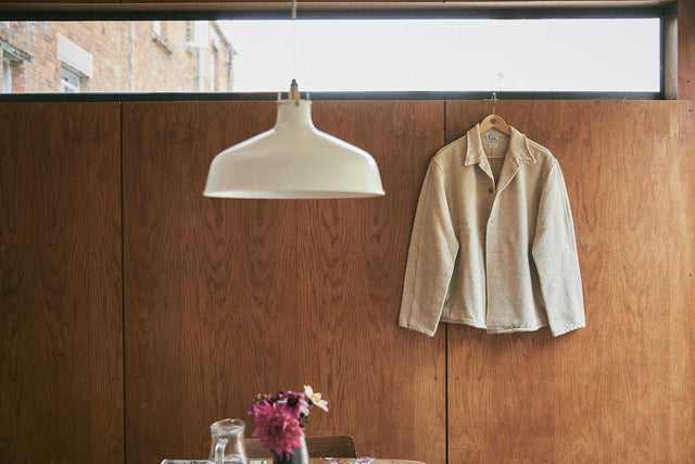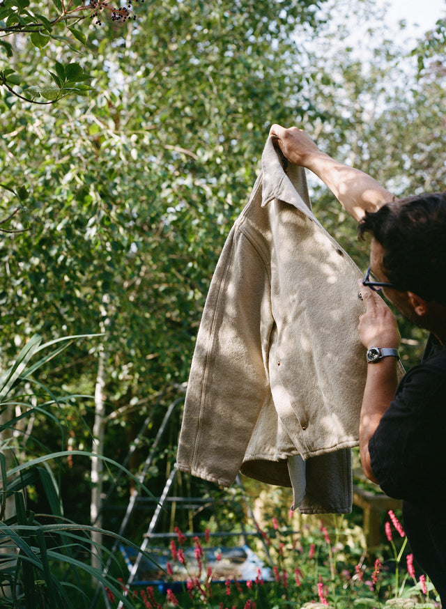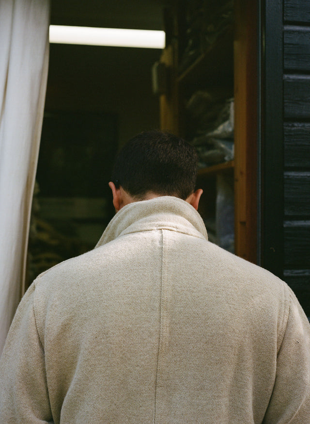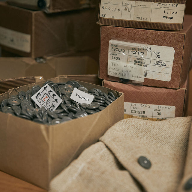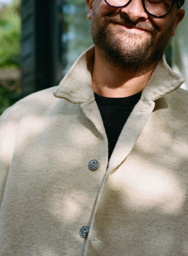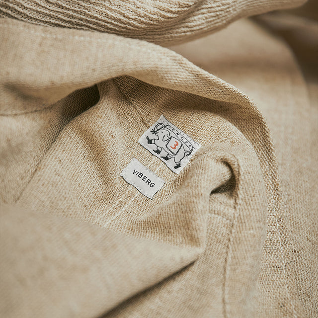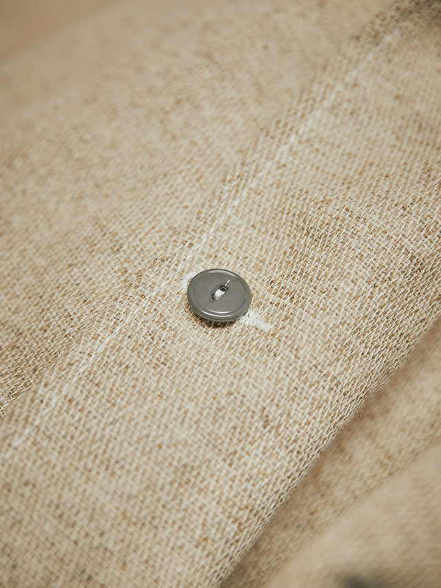 This exclusive release is cut from the final roll of Tender's English-woven Sawtooth Twill. This exceptional fabric intertwines a cotton warp with a wool-hemp weft, bestowing a distinct natural texture and appearance. Grey, Canadian-made melamine buttons were specially chosen for this project, and come from Tender’s collection of deadstock tailor’s trims.