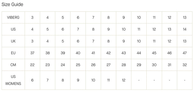 In the US & Canada, Viberg Boots size differently so we recommend sizing down 1 full size, or if you have wide feet, 1/2 a size down. Unless noted, all widths are size E.